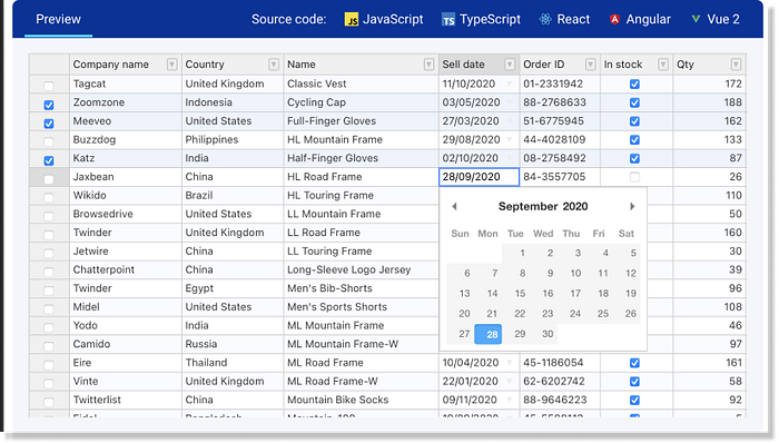 Most JS data grids come with a standard suite of functionality. This functionality includes sorting, filtering, column resizing, searching, and basic cell-editing capabilities. As such, the features that fall under this “common” functionality will not be addressed individually for the grids on this list unless there’s a noteworthy reason to do so.